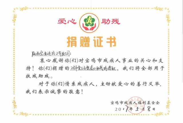 獲悉該信息后,寶光進(jìn)出口公司提出了向“寶雞市殘疾人福利基金會(huì)”捐款的申請(qǐng),此舉得到了股份公司領(lǐng)導(dǎo)的大力支持。