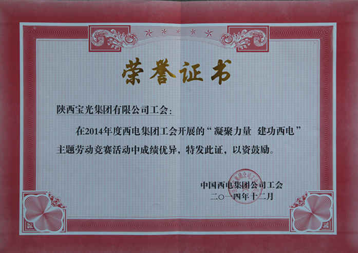 近日獲悉,在西電集團召開的“凝聚力量、建功西電”2014年度勞動競賽活動先進評選中,我公司工會等10個單位獲得西電集團工會“凝聚力量  建功西電”2014年度勞動競賽活動優(yōu)秀單位,西電集團工會為我公司頒發(fā)了榮譽證書。