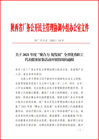 近日,從陜西省總工會傳來喜訊,寶光集團(tuán)《關(guān)于固封極柱產(chǎn)品制造部擴(kuò)充產(chǎn)能的提案》榮獲陜西省2021年度“聚合力 促發(fā)展”全省優(yōu)秀職工代表提案。