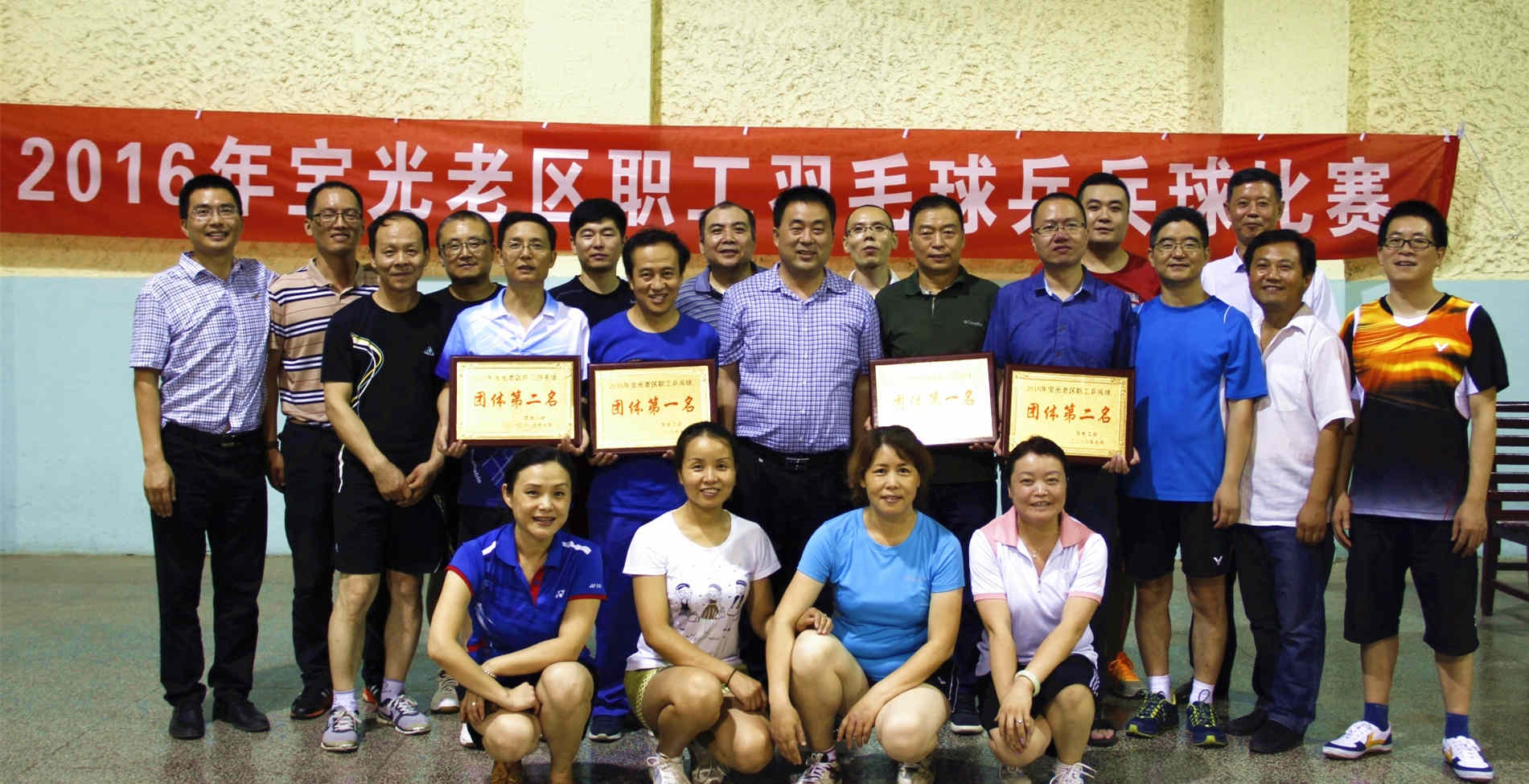比賽活動(dòng)得到老區(qū)各單位的大力支持,職工參與熱情高漲,比賽在工會(huì)副主席姜萬宏宣布比賽規(guī)則后拉開帷幕。賽場上氣氛緊張而熱烈,各參賽隊(duì)隊(duì)員精神飽滿、戰(zhàn)術(shù)靈活,渾汗如雨,比賽場面精彩不斷……經(jīng)過近4個(gè)小時(shí)的激烈角逐,氣體公司分別獲得羽毛球和乒乓球團(tuán)體賽第一名,動(dòng)力部獲得羽毛球團(tuán)體賽第二名,電子玻璃廠獲得乒乓球團(tuán)體賽第二名,其他參賽隊(duì)獲得優(yōu)秀獎(jiǎng)。賽后,參賽隊(duì)員進(jìn)行了合影留念。