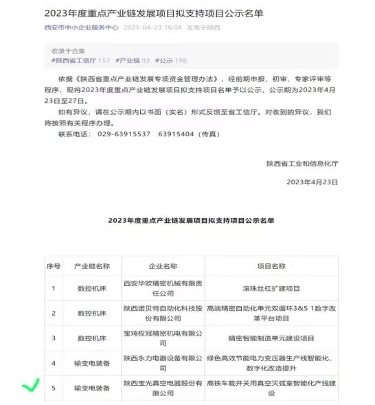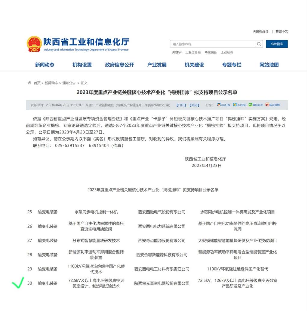 通過認(rèn)真籌備、資料審核及現(xiàn)場(chǎng)答辯,由公司組織申報(bào)的“72.5kV、126kV及以上高電壓等級(jí)真空滅弧室產(chǎn)品研發(fā)及產(chǎn)業(yè)化”項(xiàng)目與“高鐵車載開關(guān)用真空滅弧室智能化產(chǎn)線建設(shè)”項(xiàng)目分別中榜陜西省工信廳2023年關(guān)鍵核心技術(shù)產(chǎn)業(yè)化“揭榜掛帥”項(xiàng)目與重點(diǎn)產(chǎn)業(yè)鏈發(fā)展項(xiàng)目,并已進(jìn)入公示階段。